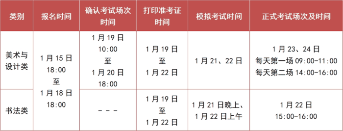 “书法类”网络初试仅安排1月22日一场考试,考生无需选择考试场次。